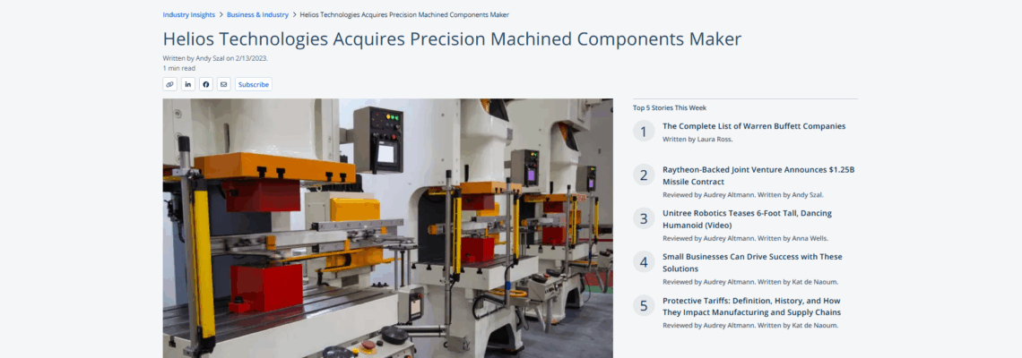 thomasnet.com | Helios Technologies Acquires Precision Machined Components Maker