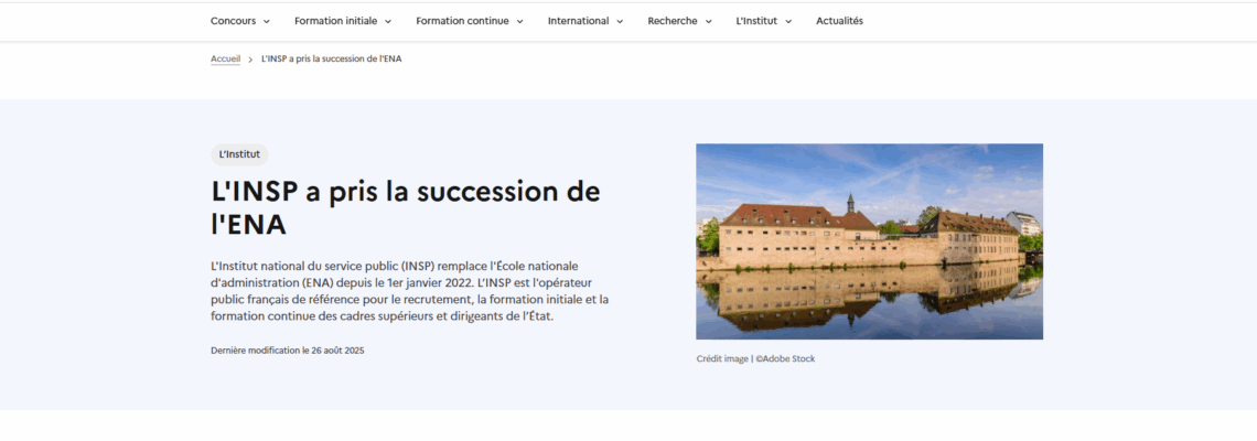 L'École nationale d'administration (ENA) a été supprimée le 31 décembre 2021. Elle est remplacée par l'Institut national du service public (INSP) depuis le 1er janvier 2022 insp.gouv.fr Le contenu de ce site reste accessible à titre d'archive. L'École nationale d'administration (ENA) a été supprimée le 31 décembre 2021.