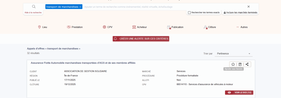 Au 14/02/2023, la recherche « transport de marchandises » a retourné 22 marchés publics ouverts. Affiner la recherche, télécharger les DCE, créer des alertes, consulter l'historique des marchés.