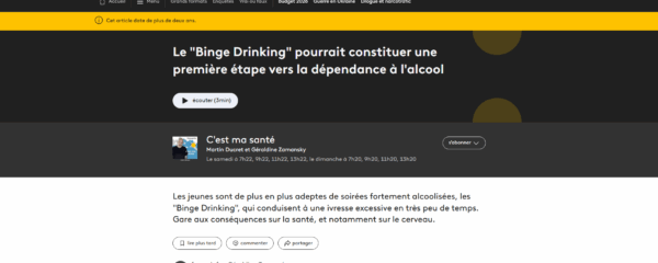 C’est ma santé Martin Ducret et Géraldine Zamansky Le samedi à 7h21, 9h21 et 11h21 s’abonner Les jeunes sont de plus en plus adeptes de soirées fortement alcoolisées, les « Binge Drinking », qui…