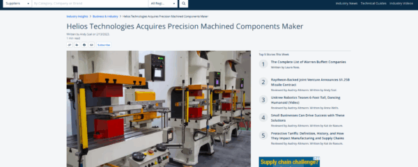 thomasnet.com | Helios Technologies Acquires Precision Machined Components Maker